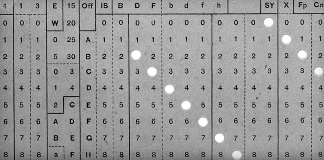 - Hollerith는 electro-mechanical(전기 기계)라는 것을 개발했는데 이것은 수를 저장할 때 전통적인 계산 시스템을 사용했다. 그런데 전동장치를 결합시킨 것이다. 격자 무늬가 있는 punch card를 사용했다. 펀치를 뚫으면 데이터를 나타낼 수 있었다.