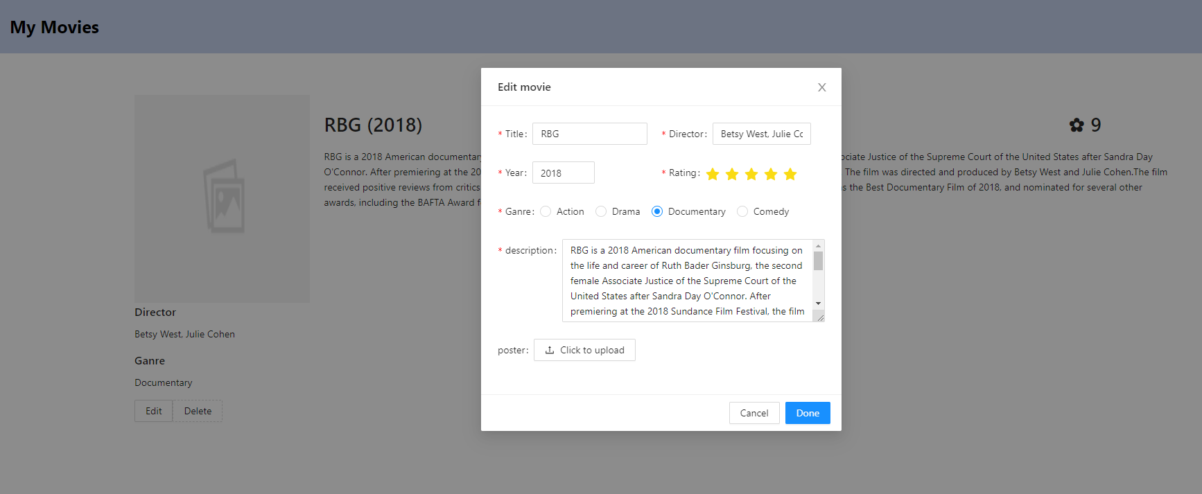 영화를 수정할 수 있는 기능도 구현했다. 영화를 받아와서 폼 안에 채워준 후, 수정이 반영될 수 있게 axios의 patch 메서드를 사용해서 구현했다.