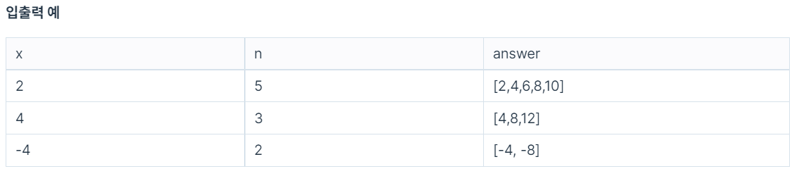 함수 solution은 정수 x와 자연수 n을 입력받아, x부터 시작해 x씩 증가하는 숫자를 n개 지니는 리스트를 리턴해야 합니다. 다음 제한 조건을 보고, 조건을 만족하는 함수, solution을 완성해주세요.