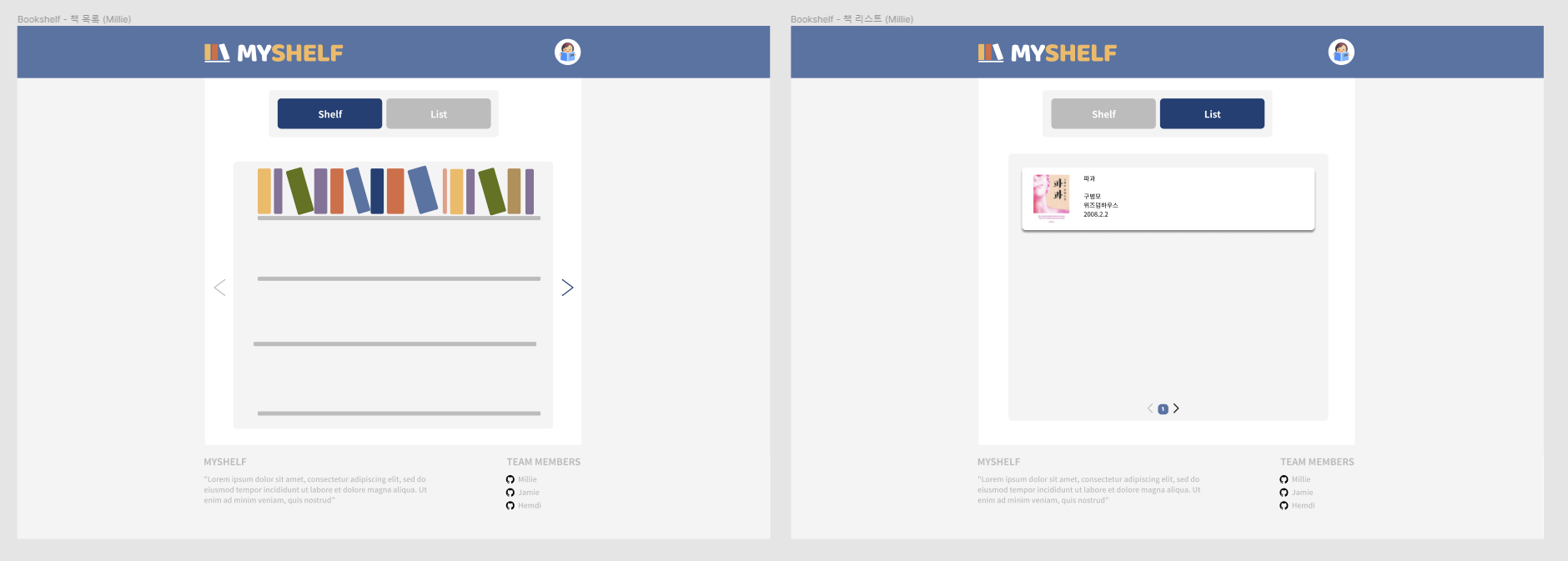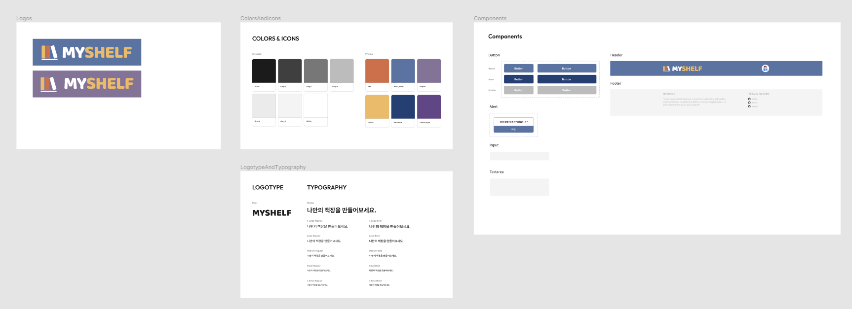 로고를 만들 때 앱의 이름을 정해야 했는데 책과 관련된 사이트여서 Book 이런 단어를 넣어야되나 했었다. 그런데 우리가 하는 프로젝트가 책장에 책을 꽂는 식으로 유저가 읽은 책을 보여주는 거라서 '책장'이라는 단어가 있었으면 좋겠고 그래서 My Shelf가 어떻냐고 제안을 했다. 뭔가 Myself 와 비슷하기도 해서 어감도 좋았다. 팀원들이 모두 동의해서 내가 제안한대로 정해질 수 있었다!