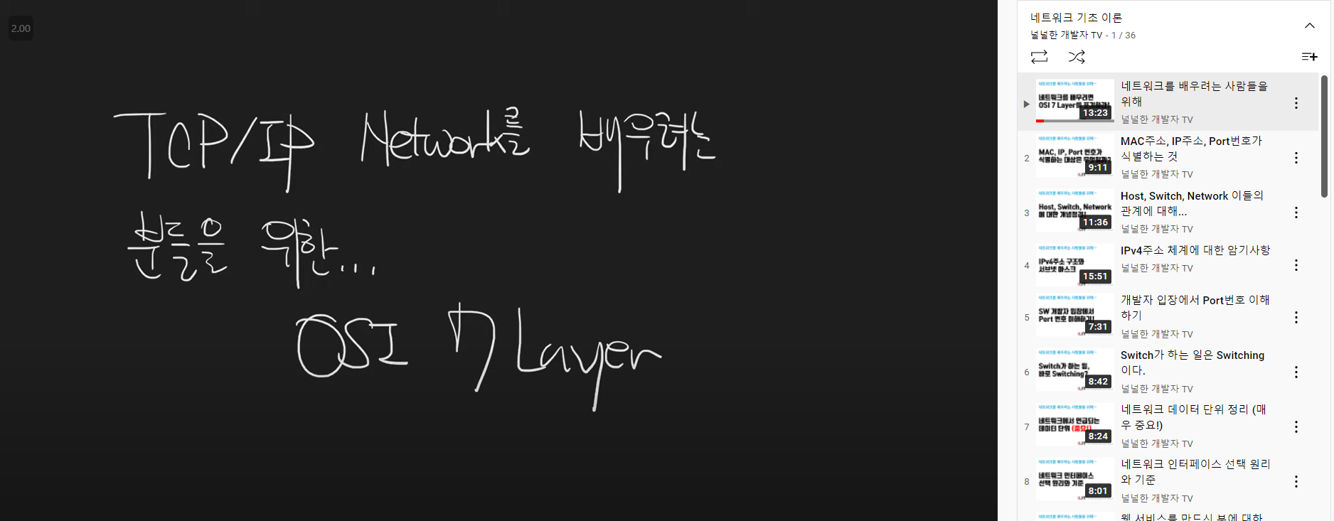 네트워크 이론을 한 번 훑기 위해서 강의를 찾아보던 중 유튜브로 '널널한 개발자 TV'의 네트워크 기초 이론을 찾았다. 하루 1~2개 정도 소화해 나가며 공부하려고 한다. 공부할 때는 보통 타이핑을 많이 했지만 이번엔 종이 노트를 많이 이용해 보려고 한다.