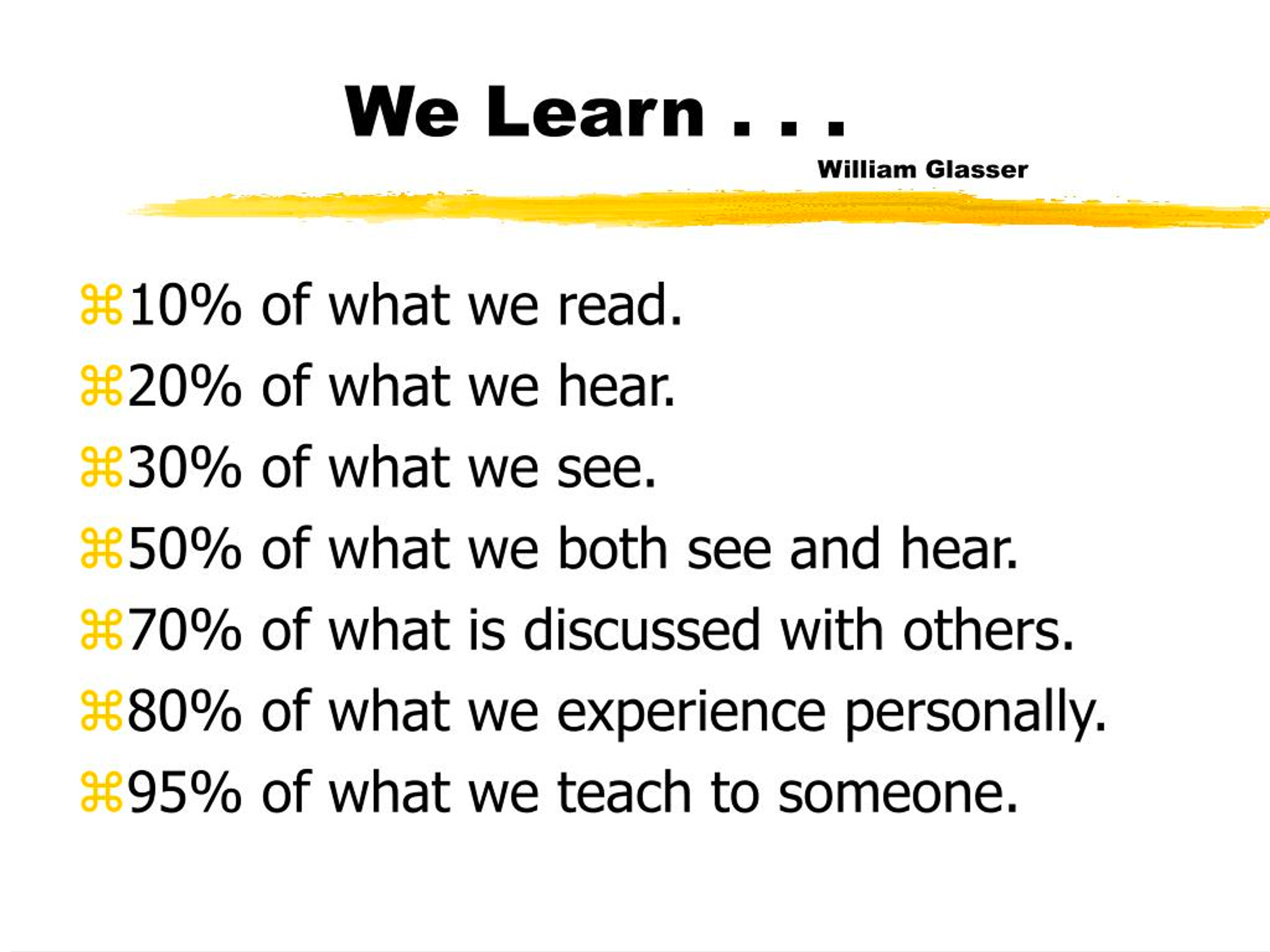 - William Glasser라는 미국의 정신과 의사는 위와 같은 학습 방법에 따른 기억률을 제시했다. 읽고, 듣고, 보는 방법으로 공부했을 때는 많아봤자 30%라는 저조한 수치만 기억되는 것을 볼 수 있다.