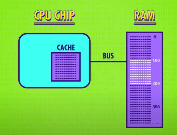 RAM은 CPU의 밖에 있는 memory module이다. 이 말은 데이터는 bus라고 하는 데이터 선들을 통해서 RAM으로 전달되거나, RAM으로 가져와야 한다는 것이다.